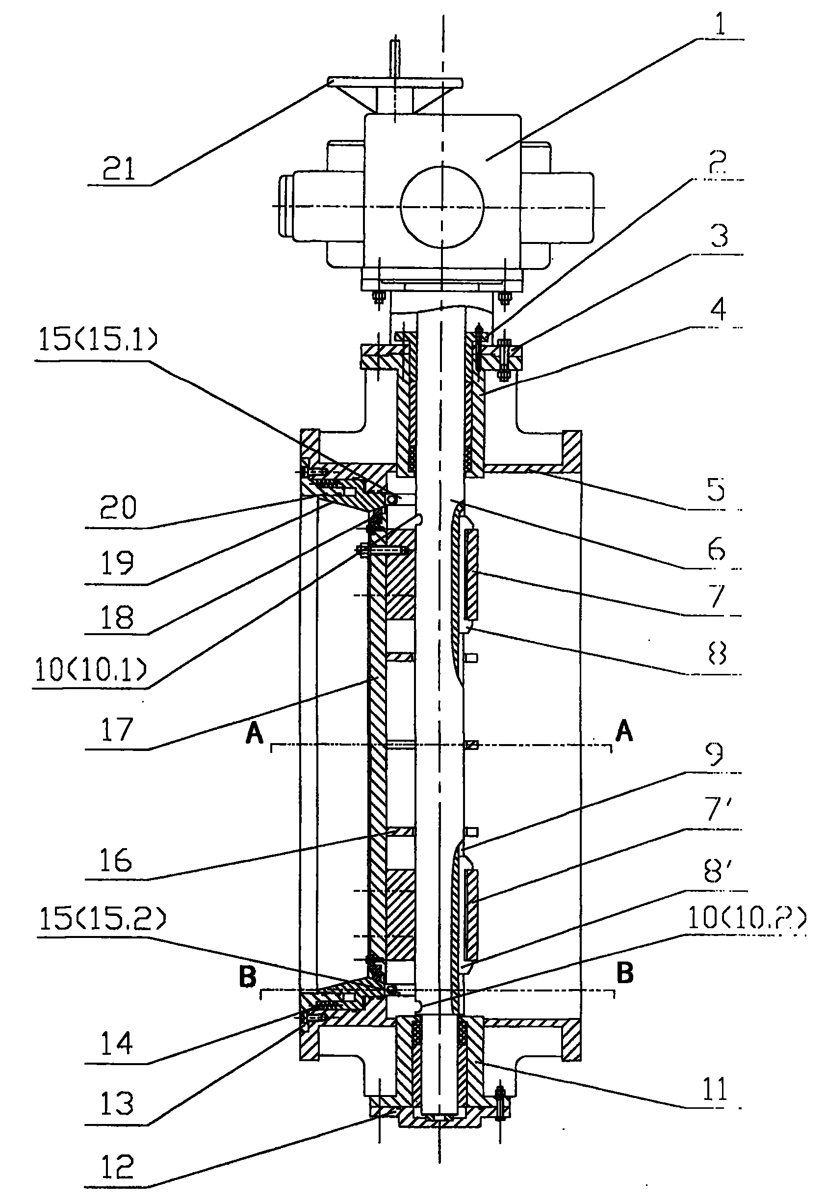 本发明所述阀体5的左右两端设有垂直于阀体5中心线的法兰,阀体5的上、下端均开有阀杆6穿过的上阀杆孔和下阀杆孔,所述蝶板17的上、下侧各设有上连接座7和下连接座7’;所述阀杆6从阀体5的上方依次穿过所述的上阀杆孔、上连接座7、下连接座7’和下阀杆孔,阀杆6与上连接座7和下连接座7’之间分别用上滑键8和下滑键8’周向固定连接;阀体5的下阀杆孔外端设有下管套11,其上固定安装有下法兰,下法兰用螺栓与封闭的下盖12连接,阀体5的上阀杆孔外端设有上管套4,其上固定安装有上法兰,上法兰上用螺栓安装有支架3,支架上3连接有驱动装置1,驱动装置1上设有手轮21(参见图1)。The left and right ends of the