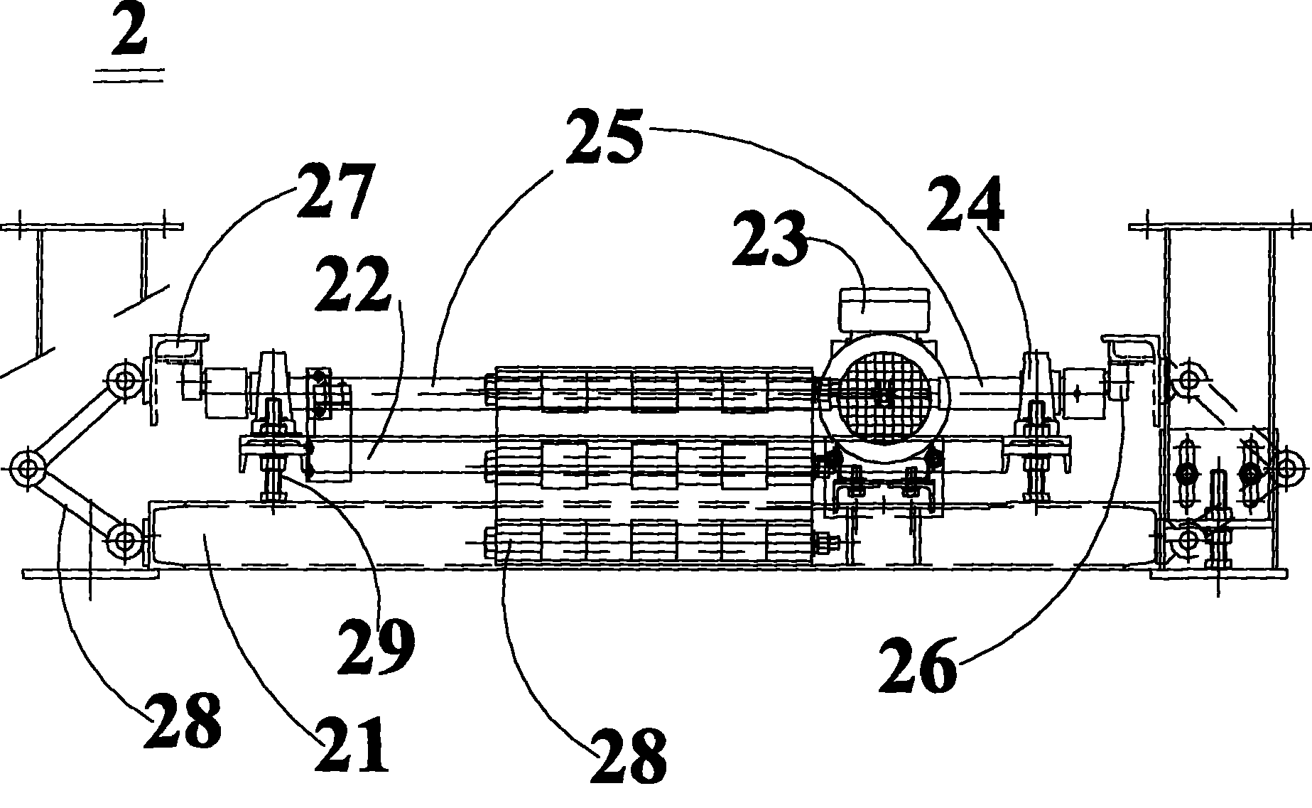 如图2所示,显示了微升降装置2的主视图,在微升降装置2的底架21(该底架21同时也是本发明直角转身输送机1的底架)上安装螺杆29,螺杆29上连接安装架22,电机23设置在安装架22上,大轴承24也安装在安装架22上,轴端的小轴承(即为微升降机构26,也可以采用凸轮的方案)支撑链条机架27。由于安装架22安装在螺杆29上,因此整个微升降装置2在工作场所安装定位之前可通过螺杆29来调节整体高度。铰链5(即限位机构28的一种具体方案,本发明也可采用其它方式的限位机构)一端连接在底架21上,另一端铰接在铰链机架27上。As shown in Figure 2, have shown the front view of