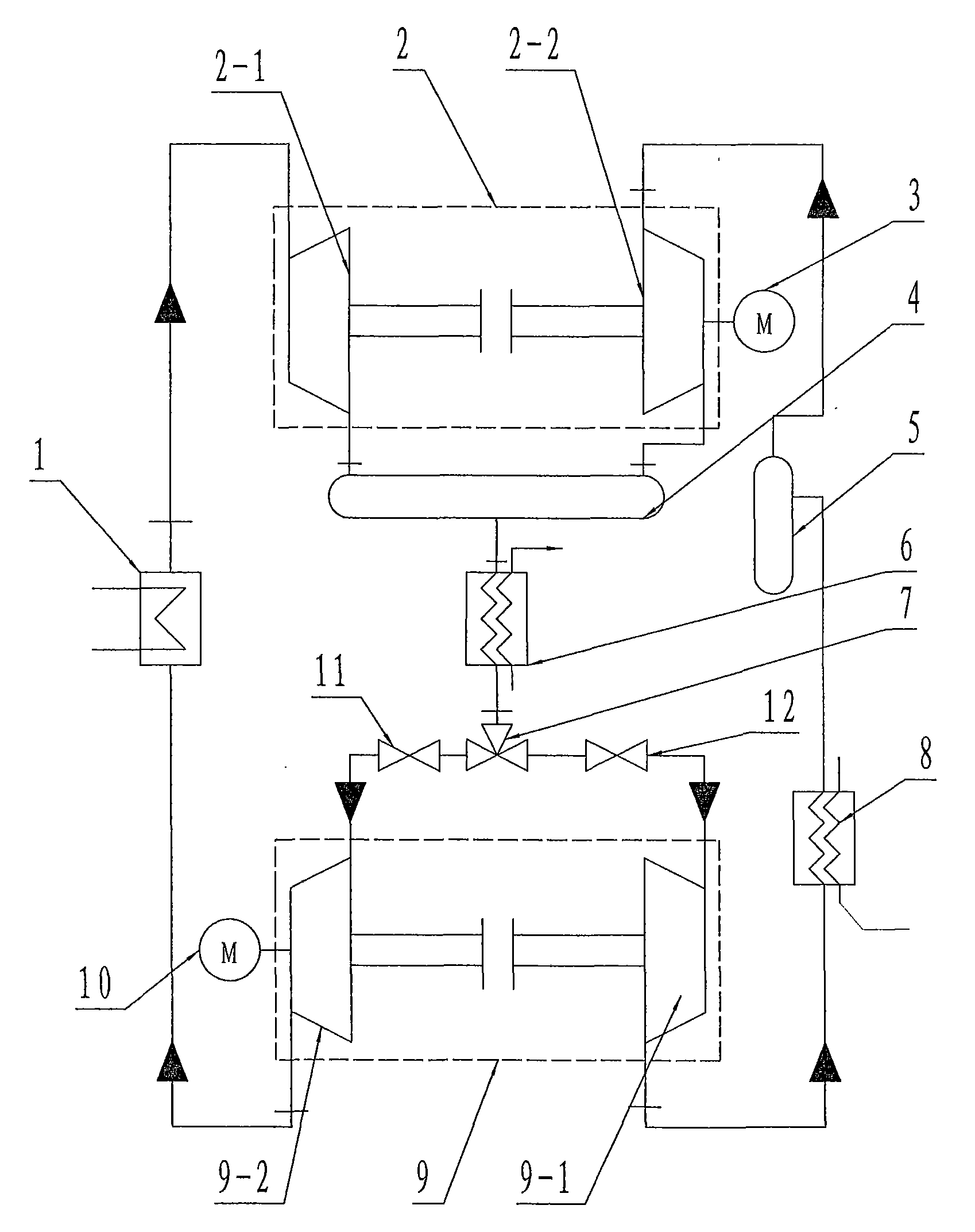 图中各标号含义如下:1.太阳能集热器;2.第一膨胀压缩机;2-1.第一膨胀压缩机的膨胀机;2-2.第一膨胀压缩机的压缩机;3.第一电动机;4.贮气器;5.气液分离器;6.气体冷却器;7.三通阀;8.蒸发器;9.第二膨胀压缩机;9-1.第二膨胀压缩机的膨胀机;9-2.第二膨胀压缩机的压缩机;10.第二电动机;11、12.电磁阀。The meanings of the labels in the figure are as follows: 1. solar heat collector; 2. the first expansion compressor; 2-1. the expander of the first expansion compressor; 2-2. the compressor of the first expansion compressor; 3. 1st electric motor; 4. Air receiver; 5. Gas-liquid separator; 6. Gas cooler; 7. Three-way valve; 8. Evaporator; 9. Second expansion compressor; 9-1. Second expansion compression 9-2. The compressor of the second expansion compressor; 10. The second electric motor; 11, 12. Solenoid valve.