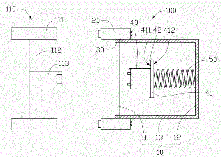如图1所示,所述充电装置100包括一外壳10、两个传感装置20、一第一电磁铁30、一插头座体40及一第一弹簧50。As shown in FIG. 1 , the