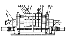图中:1-主驱动电动机2-主减速器3-上轴承座4-轴承座拉杆5-拉杆连接板6-辊缝调整螺丝7-拉杆连接螺母8-弹性支撑套9-上主轴10-下主轴11-下轴承座12-主传动齿轮13-左上主轴齿轮14-上传动齿轮15-右上主轴齿轮16-偏心轴17-齿轮连杆18-齿轮轴承19-右下主轴齿轮20-下传动齿轮21-左下主轴齿轮22-齿轮支架23-滑板24-滑轨25-底板26-丝杆27-移动螺母28-主轴滑键。