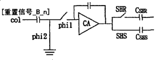 Next, shown in Fig. 3 D, the transmission transistor tx_B_n of B group (n=1,2...) be unlocked (113), and the first switch phi1 is closed (114), but second switch phi2 (115) then for breaking off.Thus, the input voltage of row amplifier CA is equivalent to (B group) picture signal and deducts (B group) reset signal of being stored, and this input voltage then receives the amplification of capable amplifier CA, the lasting closure of the SHS switch of this moment, but break off the SHR switch.Because it is closed that the SHS switch continues, thereby (or combination) to previous (A combination) voltage that is stored in SHS capacitor C SHS (step 53) that make the picture signal of B group be able to add, thereby the operation of completion signal combination.
