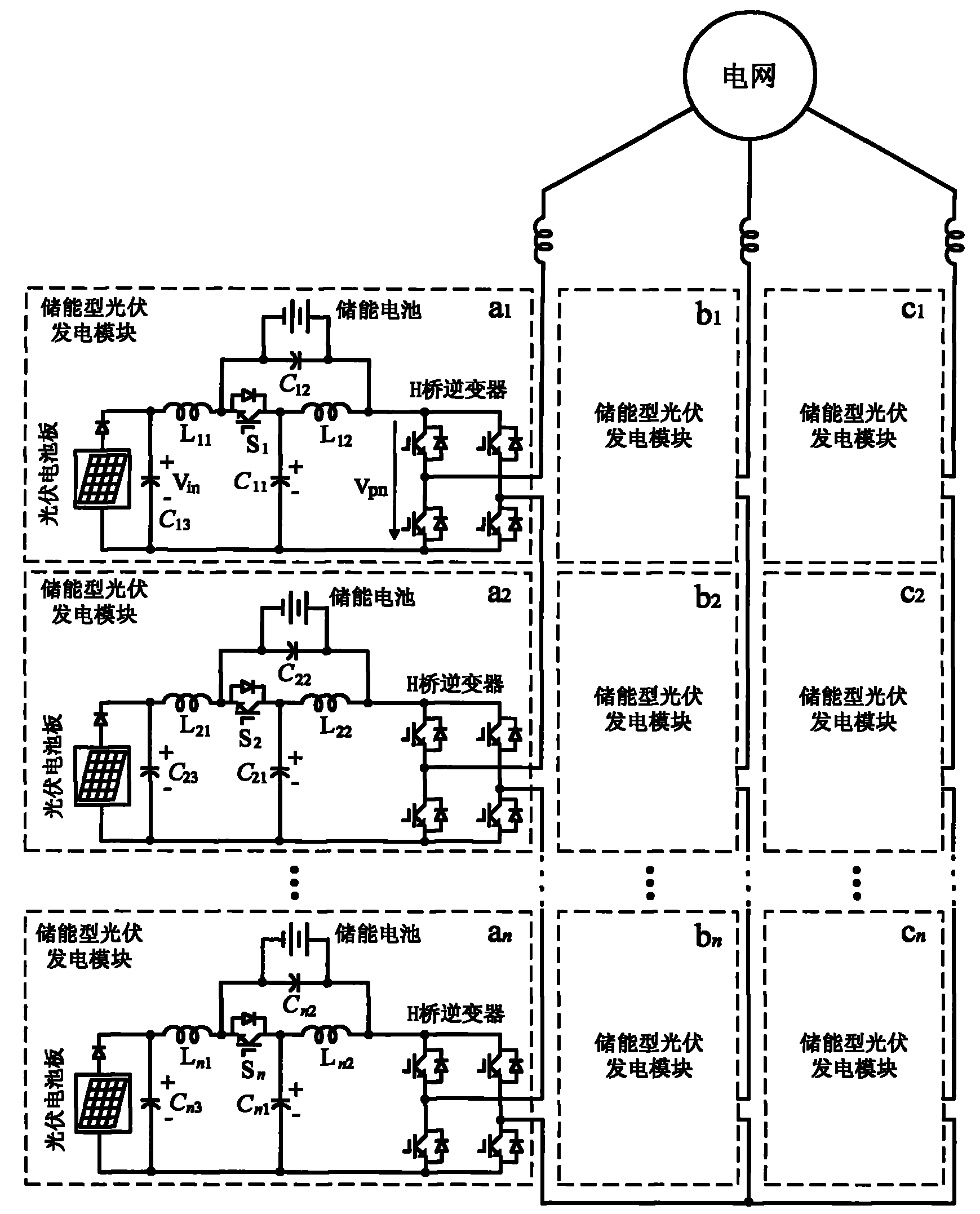 本发明的目的在于提供一种储能型级联多电平光伏并网发电控制系统,以实现:1)分布式最大功率跟踪控制,最大限度地收集太阳能,避免光伏电池板串联,消除由于光伏电池串联时局部阴影(或失配)导致的功率损失和热斑问题;2)级联多电平逆变器输出高质量电压供给电网,谐波含量低;3)可实现无变压器并网;4)高效率;5)适合高压大功率;6)各个模块采用单级功率变换实现升/降压、逆变与储能,允许光伏电池输出电压宽范围变化,具有最小化逆变器容量;7)能灵活地控制光伏发电系统传送到电网的功率,消除光伏发电系统注入电网功率的随机波动,提高供电质量;8)进行无功补偿、电力调峰控制等。The object of the present invention is to provide an energy storage type cascaded multi-level photovoltaic grid-connected power generation control system to achieve: 1) distributed maximum power tracking control to maximize solar energy collection, avoid photovoltaic panels in series, and eliminate Power loss and hot spot problems caused by partial shadowing (or mismatch) when batteries are connected in series; 2) Cascaded multi-level inverters output high-quality voltage to supply the grid with low harmonic content; 3) Transformer-free grid connection can be realized; 4) High efficiency; 5) Suitable for high voltage and high power; 6) Each module adopts single-stage power conversion to realize step-up/step-down, inversion and energy storage, allowing the output voltage of photovoltaic cells to vary in a wide range, with minimum inverter capacity; 7) It can flexibly control the power transmitted by the photovoltaic power generation system to the grid, eliminate the random fluctuation of the power injected into the grid by the photovoltaic power generation system, and improve the quality of power supply; 8) Perform reactive power compensation and power peak-shaving control, etc.