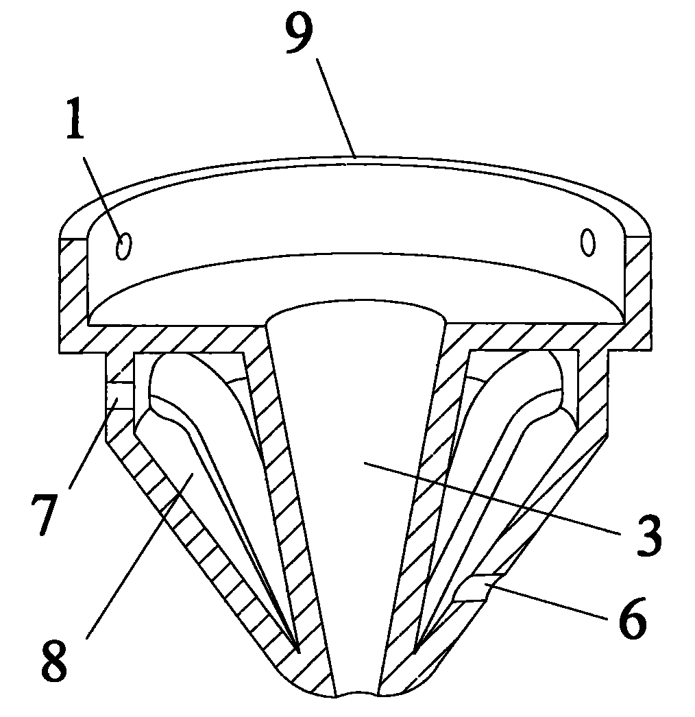 1、本发明的喷嘴内的送粉通道为内壁光滑的通道,通道的孔径从进粉口到出粉口逐渐变小,能够达到较好的送粉效果,提高送粉质量。1. The powder feeding channel in the nozzle of the present invention is a channel with a smooth inner wall, and the aperture of the channel gradually becomes smaller from the powder inlet to the powder outlet, which can achieve a better powder feeding effect and improve the powder feeding quality.