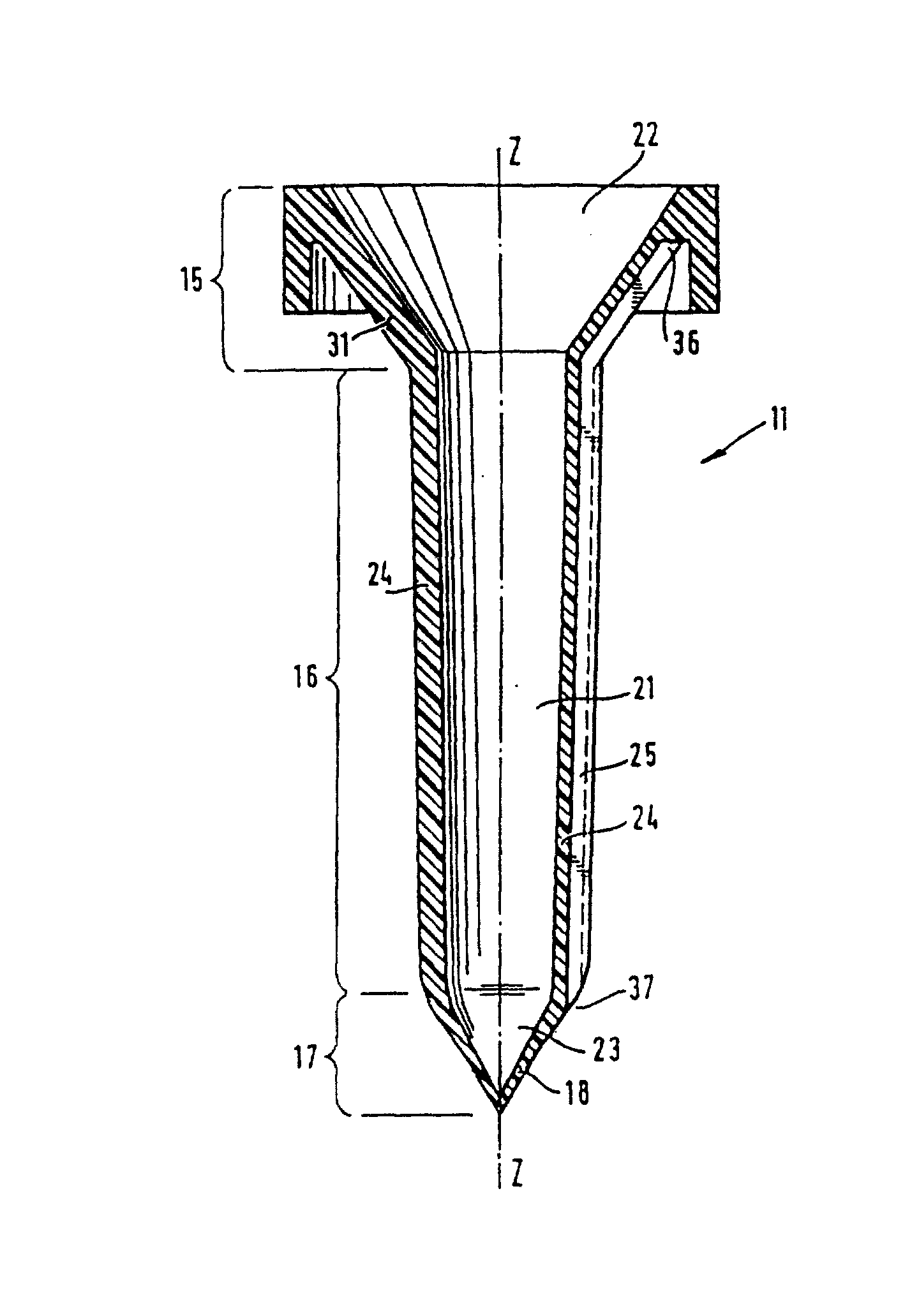 As shown in Figure 3, pipetting insert 11 has an elongated body, and an end of this body has a tapered segment 15, and has a hollow tip 17 at its other end.This tip 17 can constitute by the conical wall 18 that the liquid-transfering needle head pierces through by one.The slender tube body of pipetting insert 11 has an intervalve portion 16 of extending between tapered segment 15 and tip 17.