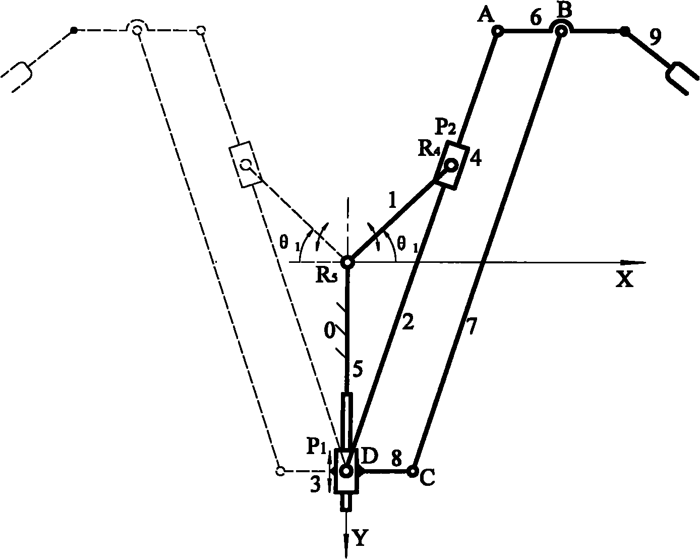 图1为本发明用于平面型数控并联运动操作的一个实施例,包括一种二轴数控平动型并联操作手,包括机架0、驱动杆1、导杆2、驱动滑块3、滑板4、直线导轨5、连杆一6、连杆二7、支撑杆8、操作器9,滑板4与导杆2构成移动副二P2后,以转动副一R4连接驱动杆1,而导杆2以转动副二D连接驱动滑块3;进一步,驱动杆1又以转动副三R5连接在机架0上,驱动滑块3与固定在机架0上的直线导轨5构成移动副一P1;同时,连杆一6与导杆2用转动副四A连接后,又用转动副五B连接连杆二7,而连杆二7与固定在驱动滑块3上的支撑杆8用转动副六C连接,且转动副四A、转动副五B、转动副六C、转动副二D构成的铰链四杆机构ABCD为平行四边形机构,操作器9用机械方法固定安装在连杆一6上。Fig. 1 is an embodiment of the present invention for plane type numerical control parallel motion operation, including a two-axis numerical control translation type parallel operation hand, including