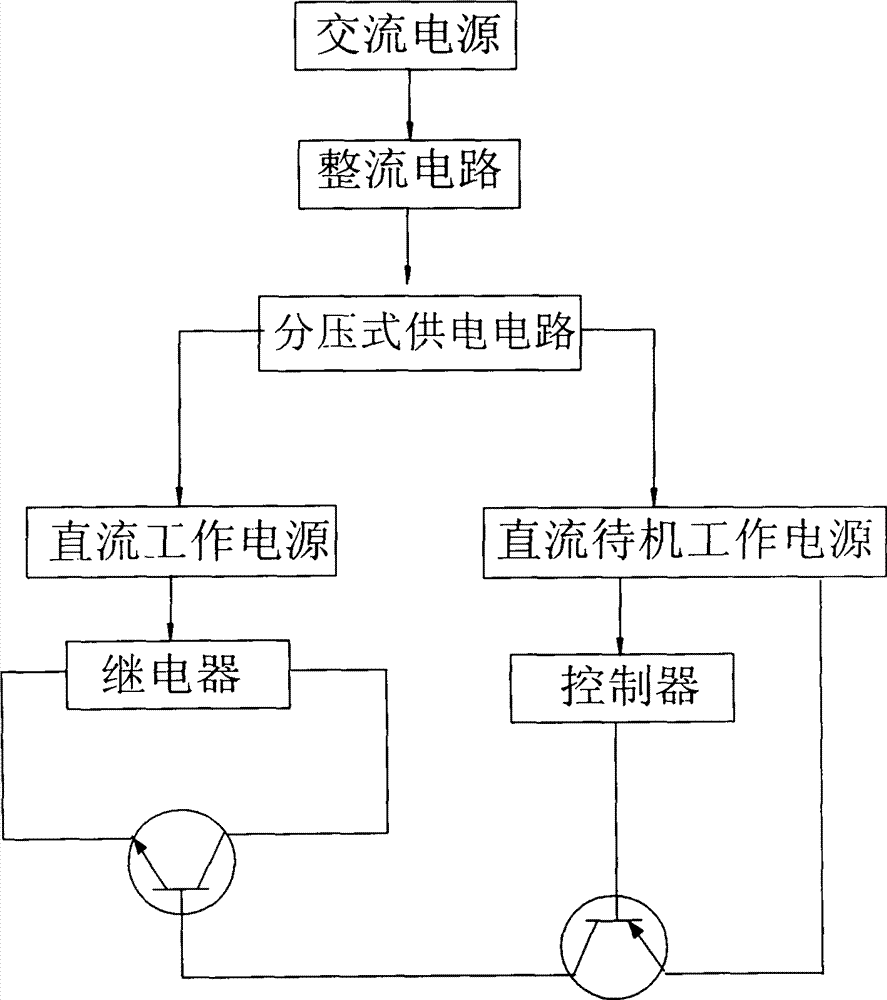 解决上述问题的技术方案是:本发明设有与控制器输出端连接的继电控制电路、为控制器和继电控制电路供电的直流电源,其特征在于:所述直流电源设有与交流电源连接的整流电路,整流电路两输出端之间设有由直流分压部件组成的分压式供电电路,分压式供电电路包括一组为继电控制电路供电的直流工作电源端,和一组为控制器供电的直流待机工作电源端;所述的继电控制电路设有与直流工作电源连接的开关控制继电器,和与开关控制继电器并联连接的第二开关三极管,第二开关三极管基极通过与第二开关三极管极性相反的第一开关三极管与直流待机工作电源连接,第一开关三极管基极与控制器输出端连接,用于为第二开关三极管提供导通偏压。The technical solution for solving the above problems is: the present invention is provided with a relay control circuit connected to the output end of the controller, and a DC power supply for supplying power to the controller and the relay control circuit, and is characterized in that: the DC power supply is provided with an AC power supply Connected rectification circuit, a voltage-dividing power supply circuit composed of DC voltage-dividing components is provided between the two output terminals of the rectifier circuit, and the voltage-dividing power supply circuit includes a set of DC working power supply terminals for relay control A DC standby working power supply terminal for supplying power to the controller; the relay control circuit is provided with a switch control relay connected to the DC working power supply, and a second switch transistor connected in parallel with the switch control relay, and the base of the second switch transistor passes through The first switching transistor, which is opposite in polarity to the second switching transistor, is connected to the DC standby power supply, and the base of the first switching transistor is connected to the output terminal of the controller for providing conduction bias for the second switching transistor.
