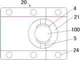 参照图1-4:风力发电机的液压式爬升自吊装装置,包括自下而上依次设置的爬升辅助平台30、安装平台20、吊装平台10,所述爬升辅助平台30和安装平台20之间连接有可使爬升辅助平台30提升的液压爬升装置40,所述安装平台20和吊装平台10之间连接有可顶升吊装平台10的液压顶升装置50,所述爬升辅助平台30和安装平台20上设有供塔架100通过的塔架通孔31,本实施例中塔架通孔31与塔架100匹配设置,所述吊装平台10上设有供待安装塔架200通过的吊装通孔11,所述爬升辅助平台30上设有用于夹紧或放松塔架100的第一液压抱紧装置60,安装平台20上设有用于夹紧或放松塔架100的第二液压抱紧装置70,吊装平台10上设有用于夹紧或放松塔架100的第三液压抱紧装置80,所述第一液压抱紧装置60、第二液压抱紧装置70、第三液压抱紧装置80分别包括相对设置的抱紧瓦4、驱动抱紧瓦4的抱紧液压缸5。所述吊装平台10上还设置将待安装塔架200移送到塔架100上方对应的安装工位的液压推送装置90。所述抱紧瓦4的内侧面设置有增大摩擦力的橡胶垫,橡胶垫用于提供克服待安装塔架或塔架重力的摩擦力。所述吊装平台由可拆卸的两部件组装而成,吊装平台的拆装分界线与吊装通孔相交,安装平台和爬升辅助平台均由可拆卸的两部件组装而成,安装平台和爬升辅助平台的拆装分界线与塔架通孔相交。