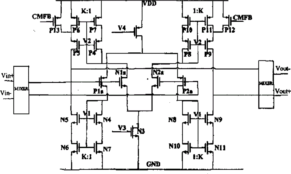 As shown in Figure 2, positive and negative input signal carries out mixing by a frequency mixer first, signal is modulated in the carrier frequency band scope, then the forward input signal converts voltage signal to downward current signal by input pipe P1a, this signal code is exaggerated K doubly by the first current mirror that is comprised of NMOS pipe N4, N6, N7, then flows to the negative sense output by N5; Simultaneously, the forward input signal converts voltage signal to upwards current signal by input pipe N1b, and this signal code is exaggerated K doubly by the 3rd current mirror that is comprised of PMOS pipe P4, P6, P7, then also flows to the negative sense output by P5; The negative sense input signal converts voltage signal to downward current signal by input pipe P2a, and this signal code is exaggerated K doubly by the second current mirror that is comprised of NMOS pipe N8, N10, N11, then flows to the forward output by N9; Simultaneously, the negative sense input signal converts voltage signal to upwards current signal by input pipe N2b, this signal code is exaggerated K doubly by the second current mirror that is comprised of NMOS pipe N8, N10, N11, then also flow to the forward output by P9, then also flow to the negative sense output by P5, mix down to output finally by crossing frequency mixer.Can get thus, the input equivalent transconductance has been exaggerated 2K doubly.Among the present invention, the value of K is taken as 3, so the bandwidth of amplifier is amplified to original three times.Last positive negative output signal modulates the signal near the base band again through a frequency mixer.Wherein each metal-oxide-semiconductor adopts conventional MOS transistor, or adopts the strain silicon MOS pipe of high mobility, with the performance of further this circuit of raising.