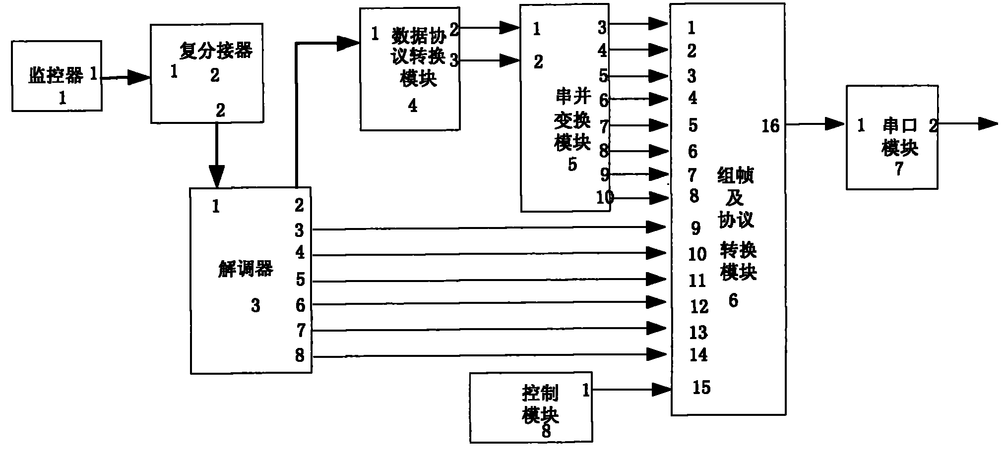 参照图1至图2,本发明由监控器1、复分接器、解调器3、数据协议转换模块4、串并变换模块5、组帧及协议转换模块6、串口输出模块7、控制模块8组成。图1是本发明的电原理方框图,实施例按图1连接线路。With reference to Fig. 1 to Fig. 2, the present invention consists of