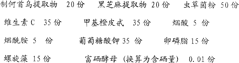 本发明公开了一种治疗毛发脱落的药物。为解决现有技术中效果差的问题而发明。由下述原料组成:制何首乌提取物、黑芝麻提取物、虫草菌粉、维生素C、甲基橙皮甙、烟酸、烟酰胺、葡萄糖酸钾、卵磷脂、螺旋藻、富硒酵母、桑椹提取物、旱莲草提取物、枸杞子提取物、龙胆草提取物、黄芩提取物、栀子提取物、山药提取物、山萸肉提取物、丹皮提取物、茯苓提取物、柏子仁提取物、天麻提取物、当归提取物、地黄提取物、灵芝菌丝体、淀粉。上述用于治疗脱发的药物,弥补了单一食疗组方适用人群有限的问题,具有多靶点的目标食疗功能,又兼中药整体调理相结合的特点,具有疗效显著,适用人群广泛的优势。