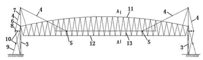 Aforesaid super-span variable cross-section prestressing force is just being put in the square pyramid space grid of finding time, two upper chord downwarpings of said Prestressed Space truss, and a lower chord is horizontal straight-bar, two upper chords are connected up and down through four diagonal web members with a lower chord.