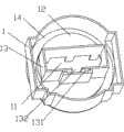 see also Fig. 1 and Fig. 2, and a kind of instrument transformer package assembling comprises housing 1, current transformer 2 and voltage sampling circuit 3.The centre of said housing 1 offers a busbar resigning hole 11; One side of said housing 1 and around said busbar resigning hole 11, constitute an inner housing 13; Between the inwall of the outer wall of said inner housing 13 and said housing 1, constitute a cavity volume 12; On the outer wall of said inner housing 13, be formed with a draw-in groove 131; On the wall body corresponding to the inner housing 13 at said draw-in groove 131 places, offer an opening 132, this opening 132 is used to make described busbar resigning hole 11 to connect each other with described draw-in groove 131, in described cavity volume 12 and along the inwall of housing 1 bottom, constitutes a groove 14.Described current transformer 2 comprises the measurement coil 22 and energy line coil assembly 21 that is packaged in the cavity volume 12; Described energy line coil assembly 21 comprises silicon steel sheet 211 and is arranged in the energy coil 212 on the silicon steel sheet 211 that described measurement coil 22 places in the groove 14 of housing 1.Described voltage sampling circuit 3 comprises the electronic circuit board 31 and copper spring 32 that is used for voltage sample, and wherein: high-precision high voltage resistance has been welded on the described electronic circuit board 31,