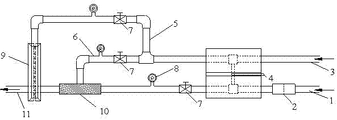 图中:1-进水管;2-管道过滤器;3-主进气管;4-联动阀;5、6-支进气管;7-调节阀;8-压力表;9-空气幕产生器;10-细水雾发生器;11-细水雾输送管;12-管体;13-进气口;14-喷气孔;15-进气室;16-喷气缝;17-固定架。 In the figure: 1-water inlet pipe; 2-pipe filter; 3-main air intake pipe; 4-linkage valve; 5, 6-branch air intake pipe; 7-regulating valve; 8-pressure gauge; 9-air curtain generator; 10-water mist generator; 11-water mist conveying pipe; 12-pipe body; 13-air inlet; 14-jet hole; 15-air inlet chamber;
