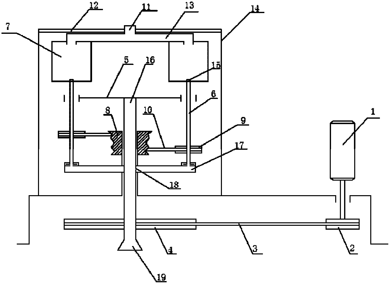 请参阅图1,本发明的球磨机包括传动机构与回转副,其中,与调速电机1联接的小皮带轮2通过第一皮带3与大皮带轮4构成第一皮带传动机构,与大皮带轮4通过中心主轴16联接并同轴运转的转盘5上对称布置有多个球磨罐7,每个球磨罐7的转轴6都与转盘5构成回转副,并且转轴6的下部联接有行星带轮9,该行星带轮9又通过第二皮带10与同机座联接的中心带轮8构成第二皮带传动机构,中心主轴16和转轴6均为空心轴,转轴6用于连接球磨罐7与出料装置17,将球磨罐7内的粉体输送到出料装置17的空腔;球磨罐7的一端与入料装置13嵌套,使之既可以完成自身的自转,又可以带动入料装置公转,转轴6与球磨罐7连接的的另一端设有出料筛板15,用于分离粉碎完成的粉体和未粉碎完成的粉体;球磨罐7和转轴6之间相通,转轴6和中心主轴16之间联接相通,中心主轴16的下端设有出料口19。在球磨罐7的上方设置入料装置13,该入料装置13为可绕轴转动的一圆形集料空腔装置,其上部设有一个圆柱形入料口11,以便与其他工艺设备连接,下部分别设有相应的圆柱形出料口与与各球磨罐7联接相通,入料装置13由球磨罐7带动公转,物料在离心力作用下经入料装置13进入球磨罐7;在入料装置13上方设置机盖12,以防止入料装置13因离心力过大而甩出;转轴6和中心主轴16之间通过一出料装置17联接相通,该出料装置17设有空腔,在中心主轴16与出料装置17连接的部分分布设有出料槽18;入料装置13内的入料通道以及出料装置17的出料通道均倾斜一定的角度设置;以方便物料和粉体的流动。Referring to Fig. 1, the ball mill of the present invention includes a transmission mechanism and a rotary pair, wherein the small pulley 2 connected with the speed regulating motor 1 constitutes the first belt transmission mechanism through the first belt 3 and the large pulley 4, and passes through the center with the large pulley 4. A plurality of ball milling jars 7 are arranged symmetrically on the turntable 5 connected with the main shaft 16 and running coaxially. The rotating shaft 6 of each ball milling jar 7 forms a rotary pair with the turntable 5, and the lower part of the rotating shaft 6 is connected with a planetary pulley 9. The belt pulley 9 forms a second belt transmission mechanism through the second belt 10 and the central pulley 8 connected with the same machine base. The central main shaft 16 and the rotating shaft 6 are both hollow shafts. The rotating shaft 6 is used to connect the ball mill tank 7 and the discharge device 17 , transport the powder in the ball mill tank 7 to the cavity of the discharge device 17; one end of the ball mill tank 7 is nested with the feed device 13, so that it can not only complete its own rotation, but also drive the feed device to revolve, and the rotating shaft 6. The other end connected to the ball milling tank 7 is provided with a discharge sieve plate 15 for separating pulverized powder and unfinished powder; They are connected and connected, and the lower end of the central main shaft 16 is provided with a