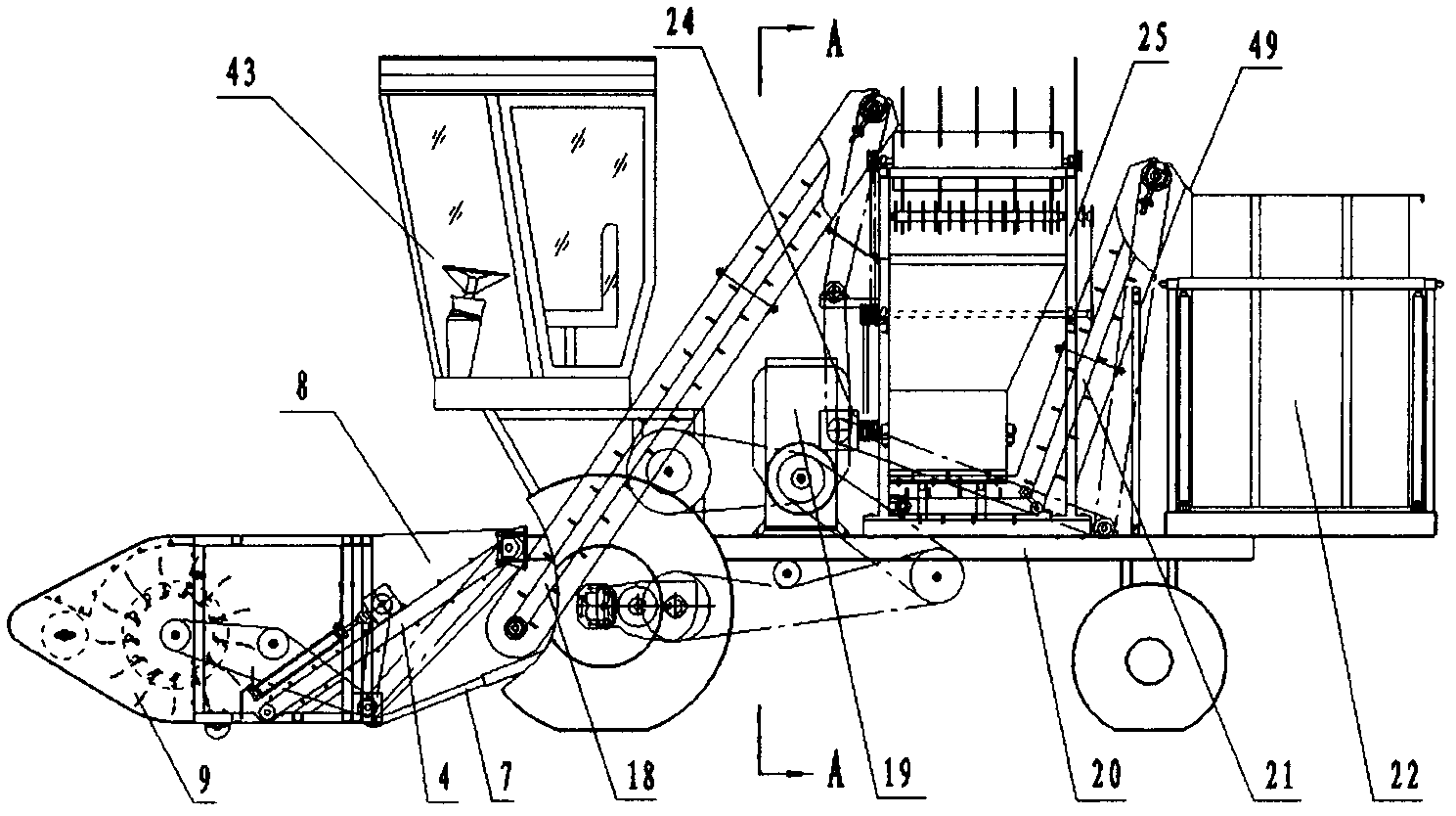 附图中标号为:1为压轮,2为弹指采摘滚筒,3为仿形地轮,4为第一输送器,5为斜输送器,6为变速器,7为液压油缸,8为连接过桥,9为采摘台,10为采摘弹指,11为管轴,12为固定角铁,13为滚筒轴,14为后法兰盘,15为中间轴,16为中间轴,17为角铁,18为第二输送器,19为发动机,20为机架,21为第三输送器,22为集料箱,23为导向护板,24为变速器,25为辣椒清选装置,26为补摘滚筒,27为逐禾滚筒,28为导料板,29为栅格凹板,30为固定弹指,31为接料漏斗,32为风机,33为星型轮组,34为分选轴,35为星型轮,36为中间轴,37为中间轴,38为挡料板,39为中间轴,40为中间轴,41为中间轴,42为变速器,43为驾驶室,44为前法兰盘,45为中间法兰盘,46为清选机架,47为补摘弹指,48为分选轴,49为防漏板,50为复脱滚筒轴,51为逐禾滚筒轴,52为第二运输器主轴,53为第三运输器主轴,54为左斜输送带轴,55为右斜输送带轴。The numbers in the attached drawings are: 1 is the pressing wheel, 2 is the snap-finger picking roller, 3 is the profiling ground wheel, 4 is the first conveyor, 5 is the inclined conveyor, 6 is the transmission, 7 is the hydraulic cylinder, 8 is the connection Bridge, 9 is the picking platform, 10 is the picking finger, 11 is the pipe shaft, 12 is the fixed angle iron, 13 is the roller shaft, 14 is the rear flange, 15 is the intermediate shaft, 16 is the intermediate shaft, 17 is the angle iron, 18 is the second conveyor, 19 is the engine, 20 is the frame, 21 is the third conveyor, 22 is the collection box, 23 is the guide guard, 24 is the transmission, 25 is the pepper cleaning device, 26 is the pick-up Roller, 27 is the roller for chasing grain, 28 is the material guide plate, 29 is the grid concave plate, 30 is the fixed finger, 31 is the material receiving funnel, 32 is the fan, 33 is the star wheel group, 34 is the sorting shaft, 35 36 is the intermediate shaft, 37 is the intermediate shaft, 38 is the baffle plate, 39 is the intermediate shaft, 40 is the intermediate shaft, 41 is the intermediate shaft, 42 is the transmission, 43 is the cab, 44 is the front flange Plate, 45 is the middle flange, 46 is the cleaning frame, 47 is the supplementary picking finger, 48 is the sorting shaft, 49 is the leak-proof plate, 50 is the decommissioning drum shaft, 51 is the grain-chasing drum shaft, 52 is The second conveyor main shaft, 53 is the third conveyor main shaft, 54 is the left inclined conveyor belt shaft, and 55 is the right inclined conveyor belt shaft.