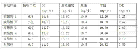Cigarette smoke analytical test: measure flue gas TPM (TPM), tar and carbon monoxide (CO) content according to GB/T 19609-2004 " cigarette is measured TPM and tar with conventional analysis with smoking machine " and GB/T 23356-2009 " the non-scattering infrared method of the mensuration of carbonic oxide in the cigarette smoke gas phase "; Press YC/T 255-2008 " the mensuration high performance liquid chromatography of main phenolic compound in the cigarette mainstream flue gas " and measure phenol, press GB/T 23228-2008 " the mensuration gas-chromatography of the peculiar N-nitrosamine of tobacco in the cigarette mainstream smoke total particulate matter-heat energy is analyzed the coupling method " and measure the N-nitrosamine (NNK) in the main flume.Result of the test is as shown in the table.