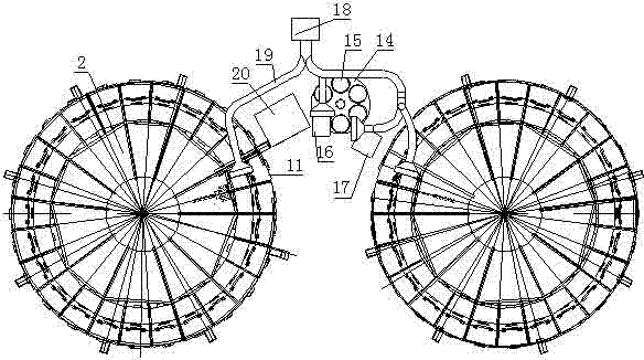 As shown in Figures 1 to 3, an automatic batching system includes two batching turntable mechanisms arranged side by side, a storage turntable mechanism, a dust suction mechanism and an electric control system; the batching turntable mechanism includes a The batching turntable base 1, the center of the batching turntable base is rotatably supported with a vertically arranged batching turntable shaft, the upper end of the batching turntable shaft is installed with a horizontally arranged batching turntable 2, and the lower end of the batching turntable shaft passes through the transmission mechanism (such as a reducer, etc.) Connected with the batching turntable motor 3, the peripheral position of the batching turntable 2 is evenly provided with 25 material containers 4, and a hanging basket 5 is arranged on the outside of each material container 4, and there is a container and a medicine container in the hanging basket 5. Spoon; the bottom of the batching turntable 2 is provided with a supporting mechanism fixed on the ground, and the supporting mechanism includes idlers 6 evenly distributed around the rotating shaft of the batching turntable. Carrying roller 6 is installed on the carrying roller mounting platform 7; Described material holding container 4 upper port is also provided with flip cover 8, and flip cover 8 is rotatably connected to holding material container 4 by the flip cover rotating shaft, and described flip cover rotating shaft makes the outside of flip cover 8 can to Open the inside and the top, and the material container 4 is also provided with an automatic switch device for flipping the cover of the material container. The automatic switch device for the flip cover of the material container includes a cylinder mechanism 9 fixed on the material container, and the cylinder mechanism 9 has a The telescopic arm protruding downwards, the lower end of the telescopic arm is hinged on the inner side of the rotating shaft of the flip cover 8; it also includes a flip cover flange structure, which includes a ring fixed on the ground around the periphery of the batching turntable Bracket, the upper end of the bracket extends inward and transversely and is provided with a ring of blank holder 10, below the binder ring 10 there is a ball rolling and crimped on the upper end of the outer side of the flip cover of the container, and the binder ring 10 is located between the two storage turntable mechanisms. There is a gap 11 in the adjacent place, and the size of the gap 11 can make the flip of a material container open from the gap 11; The turntable mechanism includes a storage turntable base fixed on the ground. A storage turntable shaft is vertically arranged on the storage turntable base. The lower part of the storage turntable shaft is connected to the storage turntable motor through a transmission mechanism. A