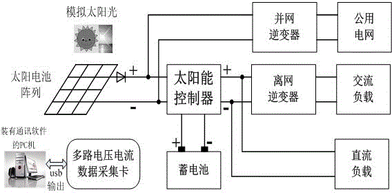 进一步,还包括多路电压电流数据采集卡、计算机和显示器,所述采集卡采集所述太阳能控制器输入端和输出端的电流和电压数据传输到所述计算机,所述显示器显示所述电流和电压数据。 Further, it also includes a multi-channel voltage and current data acquisition card, a computer and a display, the acquisition card collects the current and voltage data at the input and output terminals of the solar controller and transmits them to the computer, and the display shows the current and voltage data.