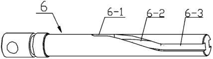 工作时,转位导向活塞杆6用于控制压板4的水平转动,夹紧导向活塞杆7用于压板4的上下移动。具体地,当转位活塞8向上运动时,带动旋转限位螺钉9在螺旋槽内移动,即依次滑过螺钉槽6-1、导向斜槽6-2和导向直槽6-3,从而旋转限位螺钉9带动夹紧导向活塞杆7发生90°转动,夹紧导向活塞杆7带动夹紧活塞10,最终实现夹紧活塞10的伸出端带动压板4转动90°;当转位活塞8再向下运动时,可实现压板4反向旋转90°。
