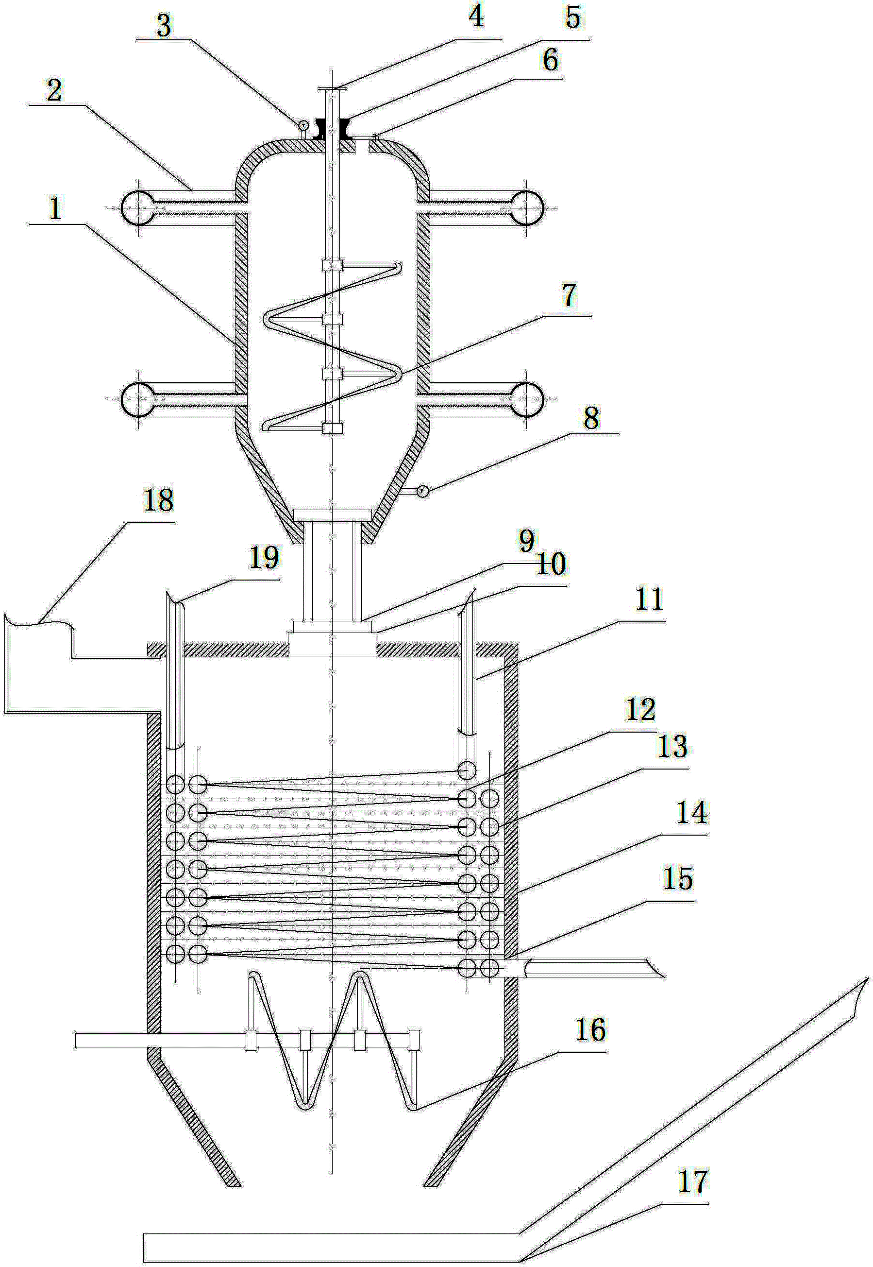 承爆仓埋于地下,其包括承爆仓壳体14,承爆仓壳体14顶部的承爆仓进料口10连接喷爆罐壳体1的出料口9;承爆仓壳体14的顶部设有第一进水管11和第二进水管19,第一进水管11连接位于承爆仓壳体14内的第一热量回收螺旋管12的进水口,第一热量回收螺旋管12的出水口连接伸出承爆仓壳体14侧壁的出水管15;第二进水管19连接位于承爆仓壳体14内的第二热量回收螺旋管13的进水口,第二热量回收螺旋管13的出水口连接伸出承爆仓壳体14侧壁的出水管15;承爆仓壳体14底部出料口的上方设有位于承爆仓壳体14内的第二螺带搅拌器16;承爆仓壳体14底部出料口的下方设有出料传动带17;承爆仓壳体14上还设有出气口18。The blast chamber is buried underground, and it includes a