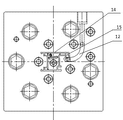Said die plate A, B have also designed flexible plastic runner (being co-extruding flow channel) except that above function.Flexible plastic also will pass through shunting, compression, moulding; Conflux with principal mode material (duroplasts) again; This river outlet is a co-extrusion material river outlet 13, and this co-extrusion material river outlet 13 has 5-10mm from flexible plastic discharging opening 15, and passing through optimal design and repeatedly debugging mould proves that preferred 5mm is good.Flexible plastic discharging opening 15 also must be evenly, mating surface even transition, no step, runner are smooth.Simultaneously, on temperature was provided with, because flexible plastic, good fluidity low than duroplasts viscosity, so extrusion temperature is set about the lower slightly 40 ° of C of 190 ° of C of temperature that set than duroplasts, it was even to guarantee that flexible plastic and duroplasts merge interface stability.Present embodiment die head periphery has also designed lifting eye, thermometer hole, heating plate installing hole.