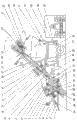 Among the figure: 1. Backpack-type maize harvester; 2. the ceding of Taiwan; 3. odontoid belt; 4. left ratchet wheel semiaxis; 5. chan frame; 6. chain; 7. double-faced toothed belt; 8. left side bevel gear box; 9. cutting table frame; 10. steel wire rope; 11. chain; 12. power input shaft; 13. last grain tube; 14. swing to operating desk; 15. pulley; 16. support arm; 17. hydraulic cylinder; 18. steering wheel; 19. driver's seat; 20. car light; 21. support; 22. hopper; 23. elasticity locker; 24. secondary drive shaft; 25. upper end sprocket shaft; 26. central shaft; 27. fan blower pivoted arm; 28. fan blower; 29. fan shaft; 30. skin block impeller; 31. hinge; 32. pole; 33. tractor with small four wheels; 34. hydraulic cylinder; 35. medium-sized tractor; 36. pole; 37. tractor front-wheel; 38. manual hoist; 39. pedal; 40. tractor left rear wheel; 41. hinge; 42. V-belt; 43. left tap wrench axle; 44. lower end sprocket shaft; 45. hinge; 46. damper; 47. universal wheel; 48. pivoted arm; 49.U shape tap wrench groove; 50. cut roller; 51. protective cover; 52. protective cover; 53. universal wheel; 54. yielding coupling; 55. toothed belt wheel; 56. double-faced toothed belt; 57. sprocket wheel; 58. right side bevel gear box; 59. chain; 60. sprocket wheel; 61. sprocket wheel; 62. toothed belt wheel; 63. the secondary semiaxis in right side; 64. tractor off hind wheel; 65. hinge; 66. belt pulley; 67. the elementary semiaxis in right side; 68. bevel gear; 69. bevel gear; 70. bevel gear; 71. the elementary semiaxis in left side; 72. belt pulley; 73. hinge; 74. damper; 75. the secondary semiaxis in left side; 76. regulating wheel pivoted arm; 77 sprocket wheels; 78. sprocket wheel; 79. chain; 80. toothed belt wheel; 81. sprocket wheel; 82. toothed belt wheel; 83. vertical shaft; 84. gear drive; 85. straight spur gear; 86. cut roller; 87. cut roller; 88. bevel gear; 89. major axis; 90. promote chain synchronously; 91. car light; 92. promote chain synchronously; 93. bevel gear; 94. belt pulley; 95. scraper plate; 96. sprocket wheel; 97. chain; 98. sprocket wheel; 99. instrument board; 100. pressure distributor; 101. elastic force regulating wheel; 102. plane seat bearing; 103. vertical shaft; 104. vertical shaft; 105. a pair of roller that cuts; 106. secondary pusher dog; 107. toothed belt wheel; 108. main pusher dog; 109. protective cover; 110. protective cover; 111. plane seat bearing; 112. toothed belt wheel; 113. arm; 114. fixed base plate; 115. toothed belt wheel; 116. hinge; 117. elasticity holding device; 118. odontoid belt; 119. protective plate; 120. angle bar; 121. vertical shaft; 122. toothed belt wheel; 123. toothed belt wheel; 124. sliding plate; 125. bevel gear; 126. fixed base plate; 127. ratchet wheel; 128. branch support arm; 129. cut roller; 130.P seat bearing; 131. straight spur gear; 132.P seat bearing; 133. straight spur gear; 134. bevel gear; 135. bearing; 136. bearing block; 137. axis; 138. bearing; 139. straight spur gear; 140.P seat bearing; 141. straight spur gear; 142.P seat bearing; 143. cut roller; 144. branch support arm; 145. toothed belt wheel; 146. minor axis; 147. wheel fork; 148. odontoid belt; 149. pusher dog; 150. angle bar; 151. flute profile clamp; 152. nut; 153. seat board; 154. screw rod; 155. slotted hole; 156. axis of elasticity; 157. ear seat; 158. flute profile clamp; 159. spring; 160. pad; 161. bearing pin; 162. ear seat; 163. bearing pin; 164. electromotor; 165. grain separator; 166. advance the grain tube; 167. co-feed tube; 168. grain output tube; 169. iron sheet tube; 170. husker sheller; 171. chute; 172. corn plug conveyer; 173. electromotor; 174. maize peel conveyer; 175. electromotor; 176. supporting leg; 177. supporting leg; 178. frame; 179. base plate; 180. opening controller; 181. horizontal fork; 182. elevating hopper; 183. eccentric rod gear; 184. roller; 185. electromotor; 186. roller; 187. steel wire rope; 188. electrical hoist; 189. electrical hoist; 190. steel wire rope; 191. dump skip; 192. corn peeling device; 193. manual flashboard; 194. corn threshing device; 195.V shape funnel; 196. dump truck; 197. wheel; 198. dreg-storing box; 199. wave sieve; 200. material storing box; 201. skewed slot; 202. sieve; 203. wheel; 204. apparatus for peeling off framework; 205. swing arm; 206. sprocket wheel; 207. bearing block; 208. rubber flap; 209. synchronization chain; 210. rubber flap; 211. sprocket wheel; 212. sprocket shaft; 213. cycloid pin reducing motor; 214. chain; 215. synchronization chain; 216. sprocket wheel; 217. sprocket wheel; 218. eccentric rod gear; 219. swing arm; 220. camshaft; 221. spring tension pulley; 222. chain; 223. auxiliary sprocket wheel; 224. electromotor; 225. power input shaft; 226. spring; 227. auxiliary sprocket wheel; 228. spring; 229. gear; 230. gear; 231. gear; 232. gear; 233. Double bearing support; 234. bearing block; 235. Double bearing support; 236. bearing block; 237. peeling rollers; 238. peeling rollers; 239. peeling rollers; 240. peeling rollers; 241. bearing block; 242. sheller unit framework; 243. sprocket wheel; 244. sprocket wheel; 245. threshing tube; 246. feed hopper; 247. threshing tube; 248. feed hopper; 249. threshing tube; 250. feed hopper; 251. auxiliary sprocket wheel; 252. feed hopper; 253. threshing tube; 254. sprocket wheel; 255. auxiliary sprocket wheel; 256. electromotor; 257. sprocket wheel; 258. auxiliary sprocket wheel; 259. power input shaft; 260. auxiliary sprocket wheel; 261. auxiliary sprocket wheel; 262. auxiliary sprocket wheel; 263. auxiliary sprocket wheel; 264. chain.