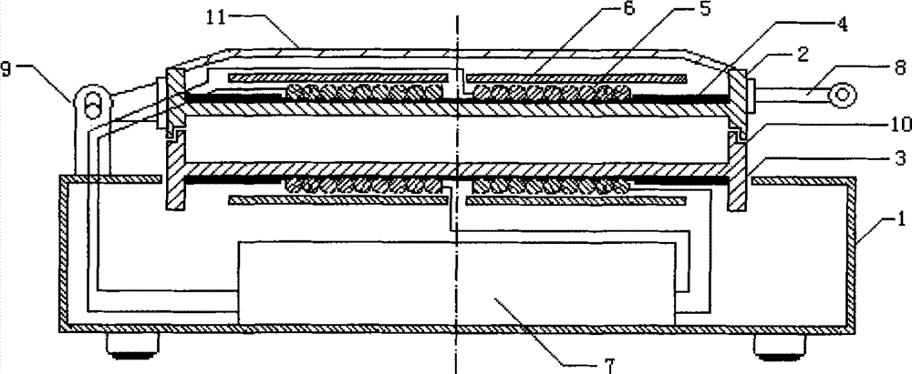 参照图1,本发明提供的电磁加热安全节能电热铛,包括外壳1、上加热盘2及手柄8、铰链9、下加热盘3,还包括所述上加热盘2、下加热盘3中的绝热板4和线圈5、磁条6以及外壳1中控制电路7;所述下加热盘3为圆形支承在所述外壳1的上方,所述上加热盘2为圆形通过铰链9支承在所述外壳1上的下加热盘3后方与所述下加热盘3同心且可以盖合在下加热盘3上,所述上加热盘2、下加热盘3的盖合处设有相扣合的榫槽10;所述上加热盘2、下加热盘3的纵截面呈“H”型,所述线圈5在一个平面上呈螺旋线形均布,分别安放在所述上加热盘2的上面凹槽中和所述下加热盘3的下面凹槽中并与所述控制电路7电相连,控制电路7控制每个线圈5的部分相对独立可以单独控制,所述绝热板4位于所述线圈5与所述上加热盘2和所述下加热盘3之间,所述线圈5的外面装有磁条6;所述上加热盘2的上面凹槽设有封盖11。Referring to Fig. 1 , the electromagnetic heating safe and energy-saving electric heating pan provided by the present invention includes a