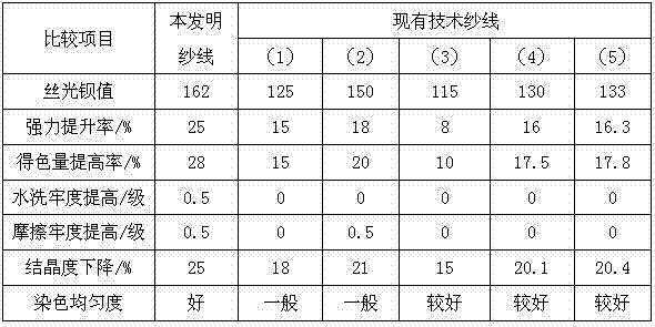 本发明与现有技术相比,在光泽及染色性能等方面明显优于上述纱线双丝光方式;对于纱线现有的双丝光技术,都是在纱线形态下进行的丝光处理,由于纱线的捻度和支数的差异,往往会形成丝光的局部不匀或“表面丝光”现象,使得丝光后的染色很容易造成染色不匀。两次丝光处理可以弥补部分缺陷,但是不能完全消除,因为纱线的捻不匀率不会因丝光次数增加而有所改变。纱线支数越细,纤维结构越紧密,对于纱线丝光来说,液碱或液氨越难渗透进入纤维内部,即使两次纱线丝光也不能使纤维丝光充分。