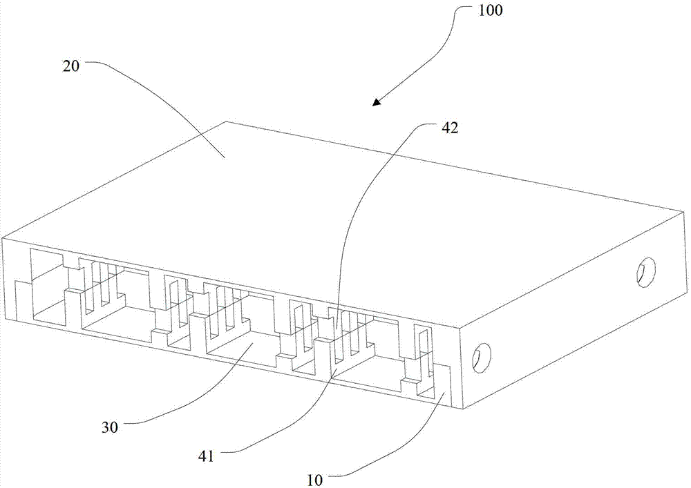 请参阅图1,本发明第一实施例提供的液冷散热器100。所述液冷散热器100上基板10、下基板20、流道30及两层扰流组件41、42。所述上基板10及下基板20相互扣合,所述流道30形成于所述上基板10及下基板20之间,所述两层扰流组件41、42层叠于所述流道30内。当然,在其他实施方式中,所述流道30也可以成型于一封闭壳体内。所述液冷散热器100也可以包括多层所述扰流组件41、42。Please refer to FIG. 1 , which shows a