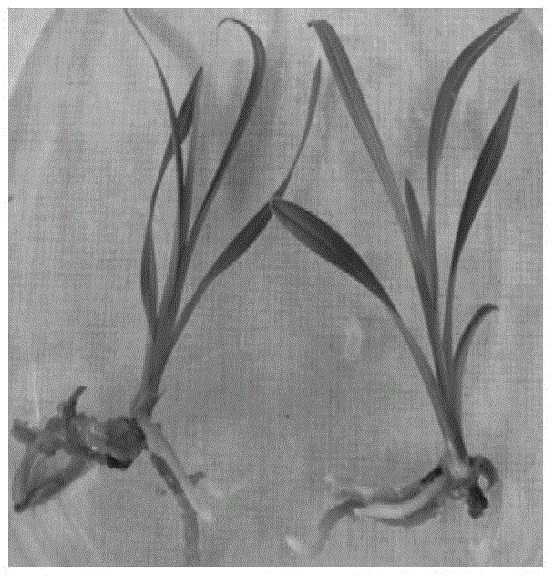 以杂交兰试管苗的根为材料,切成段后接种,暗培养,温度25℃左右(25±2℃),诱导原球茎,原球茎诱导培养基为MS(Murashige and Skoog,1962)+6-BA(6-苄氨基腺嘌呤)0.5mg/L+PIC(4-氨基-3,5,6-三氯吡啶-2-酸)0.6mg/L+水解酪蛋白200mg/L+蔗糖30000mg/L+琼脂粉5000mg/L。12天后根段膨大,开始产生原球茎,如图1所示,随后原球茎大量增殖,并逐渐分化芽苗,如图2所示,原球茎诱导率100%。The root of hybrid orchid test tube seedlings is used as material, cut into sections and inoculated, cultured in dark at a temperature of about 25°C (25±2°C), to induce protocorms, and the protocorm induction medium is MS (Murashige and Skoog, 1962)+6 -BA (6-benzylaminoadenine) 0.5mg/L+PIC (4-amino-3,5,6-trichloropyridine-2-acid) 0.6mg/L+hydrolyzed casein 200mg/L+sucrose 30000mg/L+agar Powder 5000mg/L. After 12 days, the root section swelled and began to produce protocorms, as shown in Figure 1, and then the protocorms proliferated in large quantities, and gradually differentiated sprouts, as shown in Figure 2, the protocorm induction rate was 100%.
