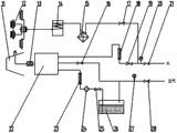 如附图1和附图2所示,一种机载泡沫除尘系统掘进机,包括截割部1、安装在截 割部1上的内喷雾装置11、主机架4、安装在主机架4下方的左右对称的行走机构5和外喷雾系统,所述行走机构5为框架结构的履带架,所述截割部1安装在主机架4一端,所述外喷雾系统包括依次串接的水源、来水截止阀21、水压力表20、外喷雾截止阀17、冷却器15、截割电机14和外喷雾装置12,且所述外喷雾装置12安装在所述截割部1上。