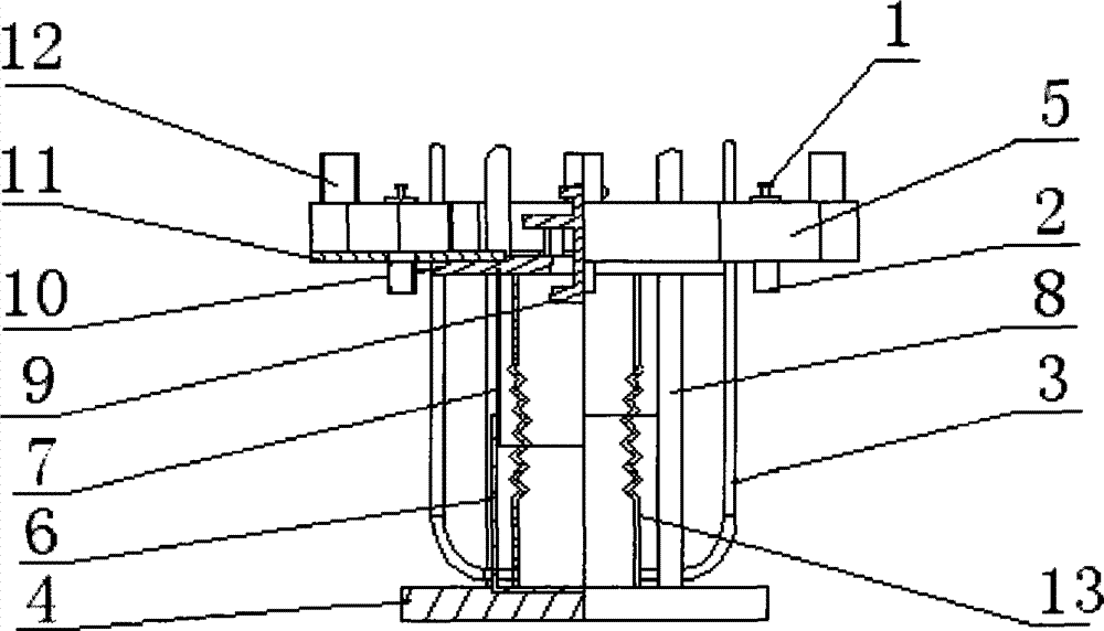 In Fig. 1,1, buoyancy tank advances draining control valve; 2, buoyancy tank intake-discharge pipe; 3, water pipe; 4, pedestal; 5, buoyancy tank; 6, fixing water vat; 7, unsteady water vat; 8, column; 9, water vat inlet valve; 10, cover plate; 11, buoyancy tank base plate; 12, buoyancy tank breathing pipe; 13, water vat inner bag.