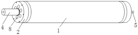 如图1、2所示,FEEDER电流引线换热器套筒内孔圆柱度检测工具,包括有通规1,通规1的两端设有加长通规2及导向部分3,所述的通规1为一个长筒体,加长通规2为中部开有螺纹孔的圆柱体,加长通规2的内壁上设有圆柱形突起作为导向部分3,两加长通规2的导向部分3分别卡在通规1两端部的内壁中,其中一个加长通规2的外壁中部向外延伸设有把手4,把手4中开有长螺纹孔,从另一个加长通规2的螺纹孔中旋入一根长螺杆5并用螺母6紧固,长螺杆5贯穿两个加长通规2、通规1以及把手4。