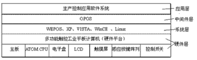 Referring to Fig. 1, the present invention includes hardware layer, operating system, middleware layer and application layer, this hardware layer mainly comprises integrated multi-functional touch-control industry flat computer; This operating system mainly comprises the various operating systems that can move on hardware platform; This middleware layer is mainly the needed hardware-related middleware of applied software development; The MES(manufacturing execution system that this application layer is developed by third party software, manufacturing execution system) system.