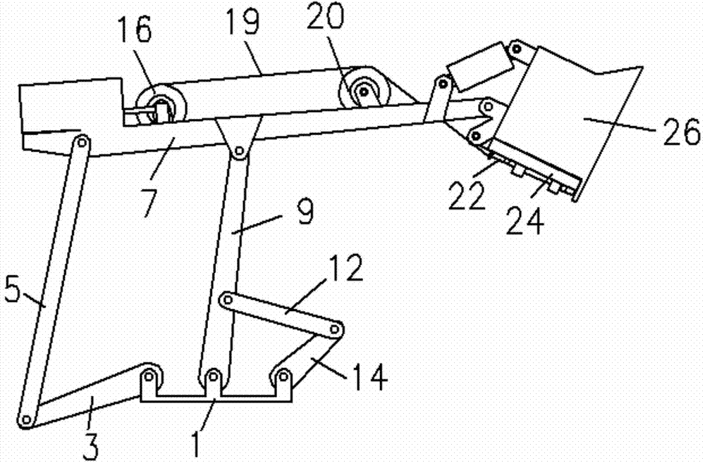 对照图4和图5,所述铲斗卸料机构包括绞盘16、钢绳19、定滑轮20、挡插22、铲斗翻转底板24和铲斗26,所述绞盘16与动臂7固连,钢绳19缠绕在绞盘16上,钢绳19绕过定滑轮20与挡插22固连,定滑轮20通过第九转动副21与动臂7连接,挡插22通过移动副23与铲斗翻转底板24连接,铲斗翻转底板24通过第十转动副25与铲斗26连接,当挖掘机挖掘时,挡插22因为重力作用会插入铲斗26底部孔中,铲斗翻转底板24无法翻转。卸料时,转动绞盘16拉动钢绳19,将挡插22拉出孔外,因为铲斗26内矿物重力作用,铲斗翻转底板24翻转,完成卸料。4 and 5, the bucket unloading mechanism includes a