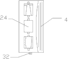 如图1所示,包括机架1和设置在机架1上的三个下肢抬高器2,其特征在于:三个下肢抬高器2分别对应人体下肢的大腿,膝盖,小腿三个部位的位置呈直线方向可前后调节的排布;下肢抬高器2包括设置在机架1内部的升降传动箱21、可升降连接于升降传动箱21的肢体支撑杆22、转动连接于肢体支撑杆22上端的肢体托台23;肢体托台23上可拆卸的设置有与人体相应部位配合的肢体模具24;机架1内部还设置有用于控制三个下肢提高器2互相配合完成模拟肢体运动的恢复治疗控制系统3。恢复治疗控制系统3包括控制器31、无线接收器32和与无线接收器32相匹配的无线遥控器33。机架1的底部设置有三对万向轮5,万向轮5上设置有卡死机构51。机架上还设置有可调温排风机,可调温排风机和下肢抬高器间隔排布,热风口朝上,并且具有一定的可调节性。
