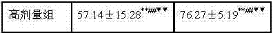 试验结果表明(详见表2),复方各剂量组的总胆固醇、甘油三酯、高密度脂蛋白胆固醇和低密度脂蛋白胆固醇的水平与大鼠脂肪肝模型组相比有显著性差异或极显著性差异,与水飞蓟宾组或低分子量肝素组相比也具有显著性差异或极显著性差异(高密度脂蛋白水平除外),这说明本发明中药组合物中中药联合应用,在大鼠脂肪肝模型上,在降低TG、TC和LDL-C上取得了很好的协同作用。 The test results showed (see Table 2 for details) that the levels of total cholesterol, triglyceride, high-density lipoprotein cholesterol and low-density lipoprotein cholesterol in each dose group of the compound formula were significantly different or extremely different from those in the rat fatty liver model group. Significant difference, compared with silybin group or low molecular weight heparin group also has significant difference or very significant difference (except for high-density lipoprotein level), which shows that the combined application of traditional Chinese medicine in the Chinese medicine composition of the present invention, in large In the rat fatty liver model, a good synergistic effect has been achieved in reducing TG, TC and LDL-C.