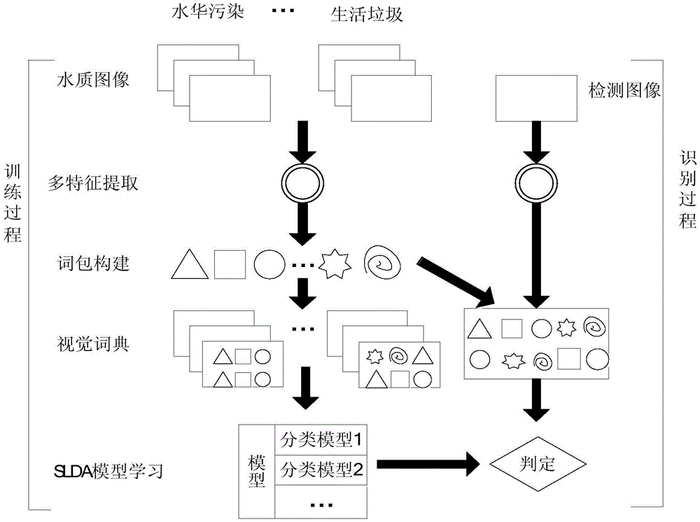 3) when in recognition, the visual dictionary is utilized to firstly obtain an image visual word packet model, then the supervised topic model is trained, and the model is introduced to enable the water quality image recognition framework to describe random factors in the water quality image in a statistical angle and describe various characteristics of the water quality image in a semantic level, so that the water quality image recognition rate is improved.