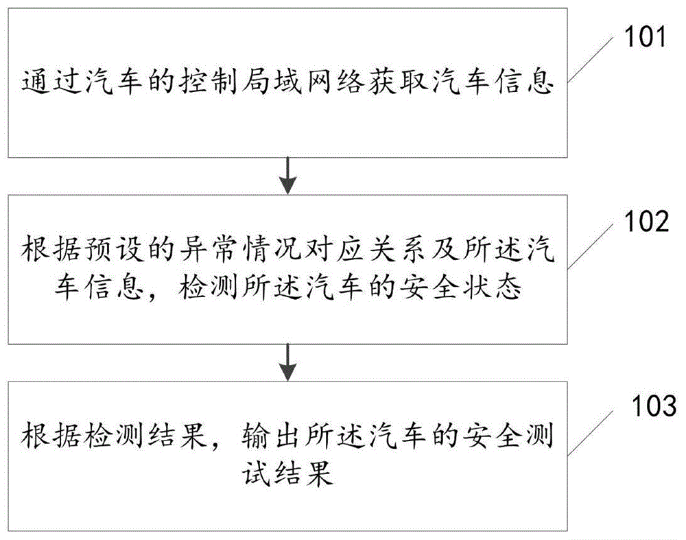 Compared with the prior art that the information generated by each part in the automobile cannot be detected to be safe, the safety testing method for the automobile information detects the safety state of the automobile according to the corresponding relation between the automobile information generated by each part in the automobile and the preset abnormal condition, realizes the discovery of potential safety threats in the automobile through safety testing, and is convenient for recovering the safety level of the automobile through methods such as repair and the like, thereby improving the safety of the automobile information.