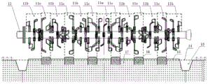 如图3所示,旋耕刀组合11包括一组中间灭茬带刀组11a,及以中间灭茬带刀组11a为对称中心对称分布在中间灭茬带刀组11a每侧且交替布置的多组侧灭茬带刀组11b和多组种床带刀组11c,即种床带刀组11c和侧灭茬带刀组11b交替排布,与中间灭茬带刀组11a相邻的是种床带刀组11c且与种床带刀组11c沿圆周错开布置;灭茬带刀组(包括中间灭茬带刀组11a和侧灭茬带刀组11b)和种床带刀组11c这种交替排布,相对于全旋模式的刀片排布方式,降低了机具的功耗。As shown in Figure 3, the