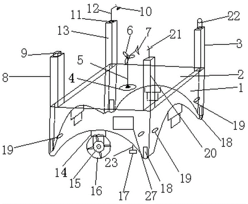 如图1-图4所示,本发明包括平台本体1,平台本体1的四角处分别装有竖直向上的第一支柱20、第二支柱3、第三支柱13和第四支柱8,平台本体1的内部有空腔26,空腔26内装有蓄电池组24和调控芯片25,平台本体1上表面上装有太阳能电池2,太阳能电池2经导线与蓄电池组24输入端相连,平台本体1上表面的中央位置装有风力发电装置,风力发电装置经导线与蓄电池组24输入端相连,平台本体1底部向下装有防水电机14,防水电机14与均布在平台本体1四个侧面下部的4台螺旋桨推进器15、蓄电池组24相连,平台本体1四个侧面上装有至少一个水质传感器19,平台本体1四脚下面的支撑腿上均装有水质取样检测装置18,第一支柱20的顶部装有天线21,第二支柱3的顶部装有GPS导航定位仪22,第三支柱13的顶部底座11上装有向上的支杆12,支杆12顶部装有摄像头10,第四支柱8的顶部装有风力传感器9,平台本体1的底部前端经连接杆23装有声纳17,所述水质传感器19接调控芯片25的PAO、PA1脚,风力传感器9接调控芯片25的PA2、PA3脚,水质取样检测装置18接调控芯片25的PA4、PA5脚,天线21接调控芯片25的PA6、PA7脚,风力发电装置接调控芯片25的PC11、PC12脚,防水电机14接调控芯片25的PC6-PC9脚,声纳17接调控芯片25的PC4、PC5脚,蓄电池组24接调控芯片25的Vref+、Vref-脚,GPS导航定位仪22接调控芯片25的PA9、PA10脚,摄像头10接调控芯片25的PC14、PC15脚,构成自动监测结构。As shown in Figures 1-4, the present invention includes a