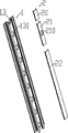 如图8所示,所述装饰盖板2包括位于所述承托臂41上、下方向的上盖板20、下盖板22以及位于所述上盖板20与下盖板22之间的中间盖板21,所述中间盖板21上设置有能够让所述承托臂41上的钩挂臂411穿过的中间孔210,所述中间盖板21通过所述中间孔210套装在所述承托臂41上,所述上盖板20、中间盖板21、下盖板22能够依次盖在所述顶端槽口140上。这样,可以把所述中间盖板21设置为标准件,按照所述承托臂41的设置位置灵活地盖在所述顶端槽口140上,通过适当调整所述中间盖板21的位置即能够使所述中间孔210与所述插接孔131对齐,操作简便,然后按照所述中间盖板21的位置、所述立面饰板定位龙骨1的总长度再截取适当长度的所述上盖板20、下盖板22即可。