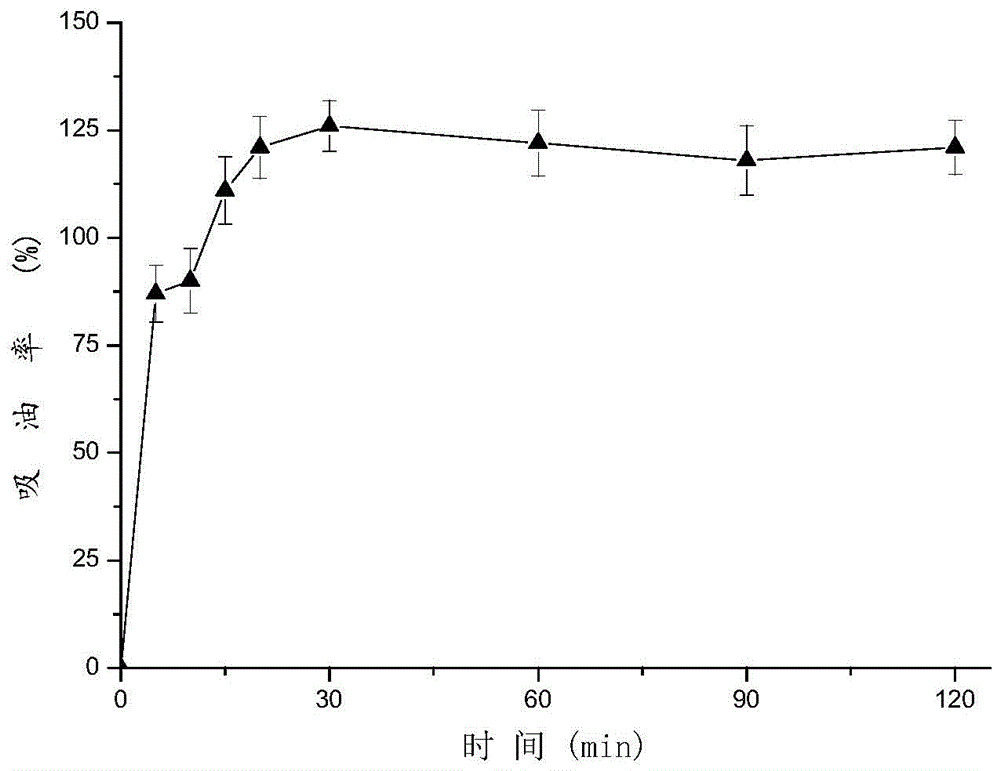 海带渣的吸油率在0-20min时间段内缓慢上升,并于30min左右达到最大, 吸油率为128%,随着时间延长,吸油率基本稳定在该水平不变,这说明海带渣 中的纤维素成分可在短时间内吸附超过自身重量的柴油。The oil absorption rate of kelp slag rises slowly in the time period of 0-20min, and reaches the maximum at about 30min. The oil absorption rate is 128%. With the extension of time, the oil absorption rate is basically stable at this level, which indicates that the fibers in the kelp slag The vegetarian component can absorb diesel oil that exceeds its own weight in a short time.