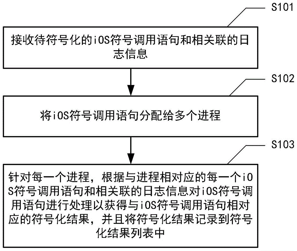 In operation S103, for each process, the iOS symbol call statement is processed according to each iOS symbol call statement corresponding to the process and associated log information to obtain a symbolized result corresponding to the iOS symbol call statement, and the symbolized result is recorded into a symbolized result list. After the tokenization results for all iOS symbolic call statements are obtained, the list of tokenization results may be output to the hard disk for persistence. Furthermore, after the symbolization results for all iOS symbol call statements are obtained, symbol map table file unmatching information indicating information and number of iOS symbol call statements or files for which no matched or fuzzy matched symbol map file can be found, symbol map table file fuzzy matching information indicating information and number of iOS symbol call statements or files for which a fuzzy matched symbol map file is found, and statistics indicating number of symbolized iOS symbol call statements or files, number of non-symbolized iOS symbol call statements or files, and the like may be output.