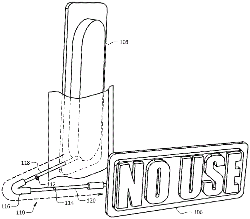 In one embodiment, the collapsible fluid conduit 110 includes a plug 112, the plug 112 adapted to be inserted into a valve 114 and then block the internal fluid passageway of the collapsible fluid conduit 110, thereby preventing fluid from flowing from the tank 108 to the end of the life indicator 106. In one embodiment, the collapsible fluid conduit 110 includes a flexible elbow 116 or sleeve that couples a first tube segment 118 to a second tube segment 120. The first tube segment 118 and the second tube segment 120 are hollow and facilitate fluid flow therethrough. It should be understood that other fluid conduit configurations are also intended to be encompassed by the present disclosure. For example, in one embodiment, the collapsible fluid conduit 110 may comprise a flexible hose structure. It should also be appreciated that in one embodiment, when the collapsible fluid conduit 110 is collapsed closed, fluid may still flow from the tank 108 to the end of the life indicator 106, but at a reduced flow rate, such as a flow rate of about 1/5 for an unfolded fluid flow rate, or a flow rate of about 1/10 for an unfolded fluid flow rate.