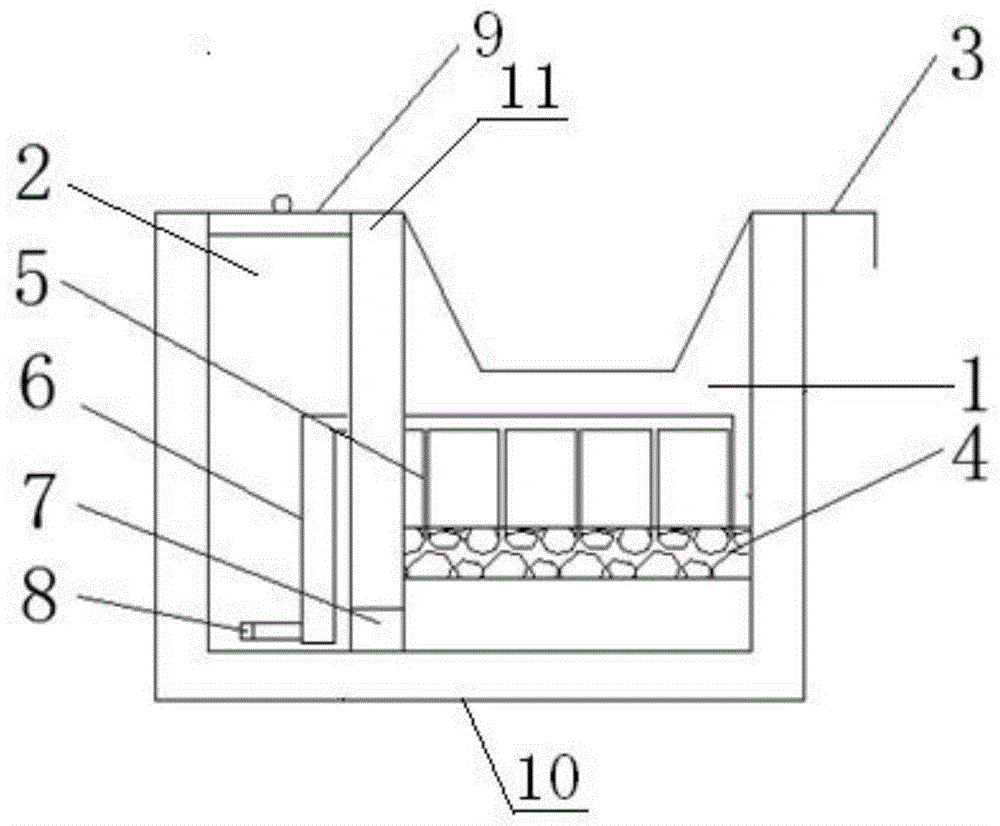 如图1所示,本发明的植被过滤沟槽,包括由混凝土制成的沟槽主体10,沟槽主体10由相互连通的集水区1和排水区2组成;集水区1顶端架设有植被种植区3,植被种植区3下方为水质净化区4,水质净化区4位于集水区1内,水质净化区4的净化滤材由质量百分含量为20%的鹅卵石、50%的碎石、15%的酸改性凹凸棒土以及15%的珊瑚沙14组成,水质净化区4上表面安装有多根虹吸管5,虹吸管5插入净化滤材上表面,虹吸管5通过干管与排水管6连通,排水管6出口伸入排水区2内,排水管6出口的高度低于虹吸管5进口的高度,排水管6出口处套设有拦截网罩8,拦截网罩8为中间填充有棉纱布的双层钢丝网,拦截网罩8扣在排水管6出口上;排水区2顶部设有盖板9,盖板9上嵌有铁环以便于盖板9的启闭;集水区1和排水区2之间设有间隔部11,间隔部11底部设有出水口7,集水区1和排水区2通过出水口7相互连通。本发明植被过滤沟槽通过设置的虹吸管5能够及时清除堵塞净化滤材的淤泥,从而保证净化滤材长时间高效工作,及时收集处理初期雨水,达到控制面源污染的效果。As shown in FIG. 1 , the vegetation filtering trench of the present invention includes a trench