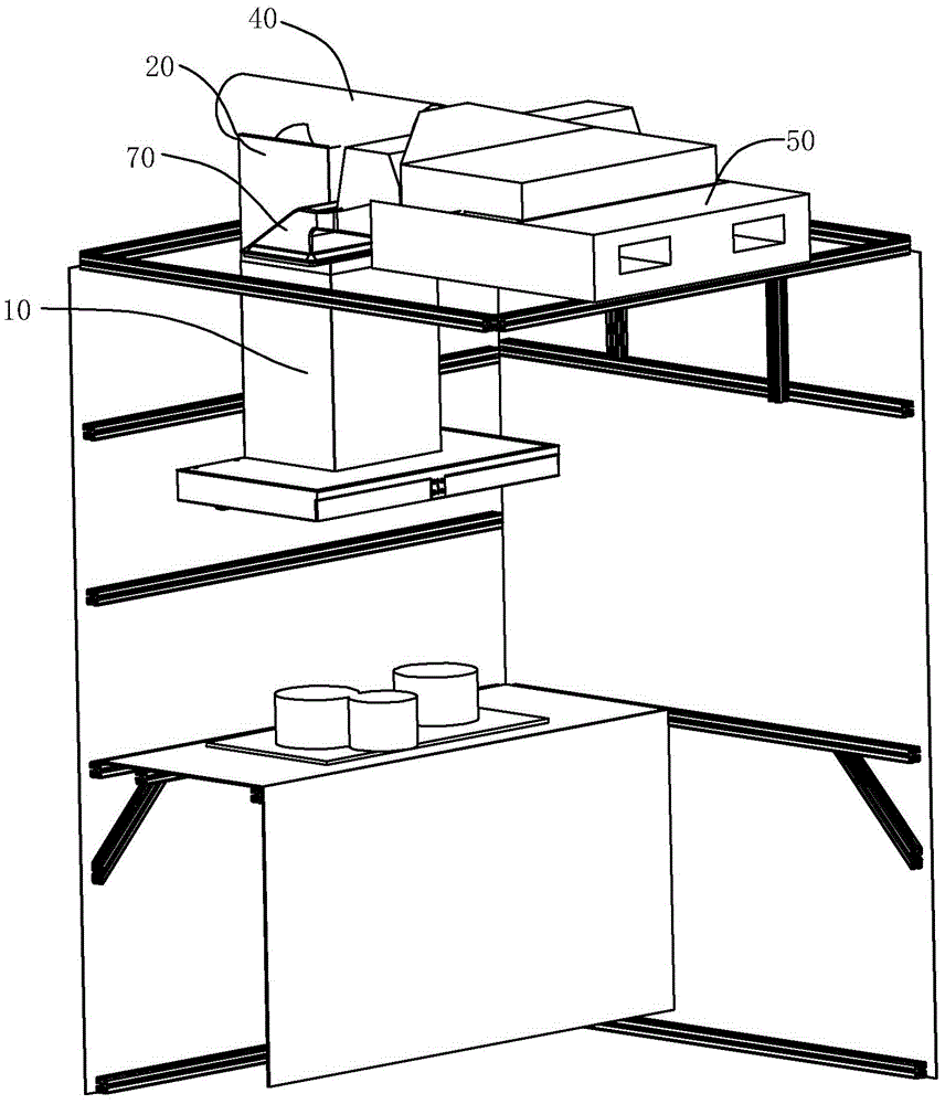 上述吸油烟机10以及排烟管道20即可组成烟气排出系统,吸油烟机10与空气净化装置50即可组成内循环净化系统,该风幕机构70即可形成气流阻隔系统,例如可以在吸油烟机的四周形成向下向外吹散的气流风幕,用于产生气流阻隔。另外还设有热交换系统,该热交换系统可以单独设置,例如空调等,也可以如上述室内空气净化装置中,设置制冷制热模块,另外还可以设置新风补偿系统,该新风补偿系统可以是在室内空气净化装置中设置相应的模块,也可以单独设置。并且新风补偿系统还可以包括增氧模块,用于调节室内空间的氧气含量。该新风补偿系统可以是在该风幕机构70内形成,也可以是独立形成,即在厨房各个位置顶部设置换气口。The above-mentioned