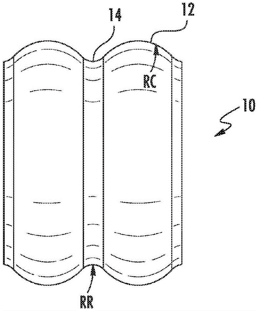 如上文所讨论的那样,在截面中,典型的环形波纹设计具有根部14中的较小的U形弧RR——其限定次要直径,紧接着是在峰部12处形成主要直径的较大弧RC。这是便利的形状(见图1),因为该形状使得制造工具的形状和设计能相对简单。As discussed above, in cross section, a typical annular corrugated design has a smaller U-shaped arc RR in the root 14 - which defines a minor diameter, followed by a larger one at the