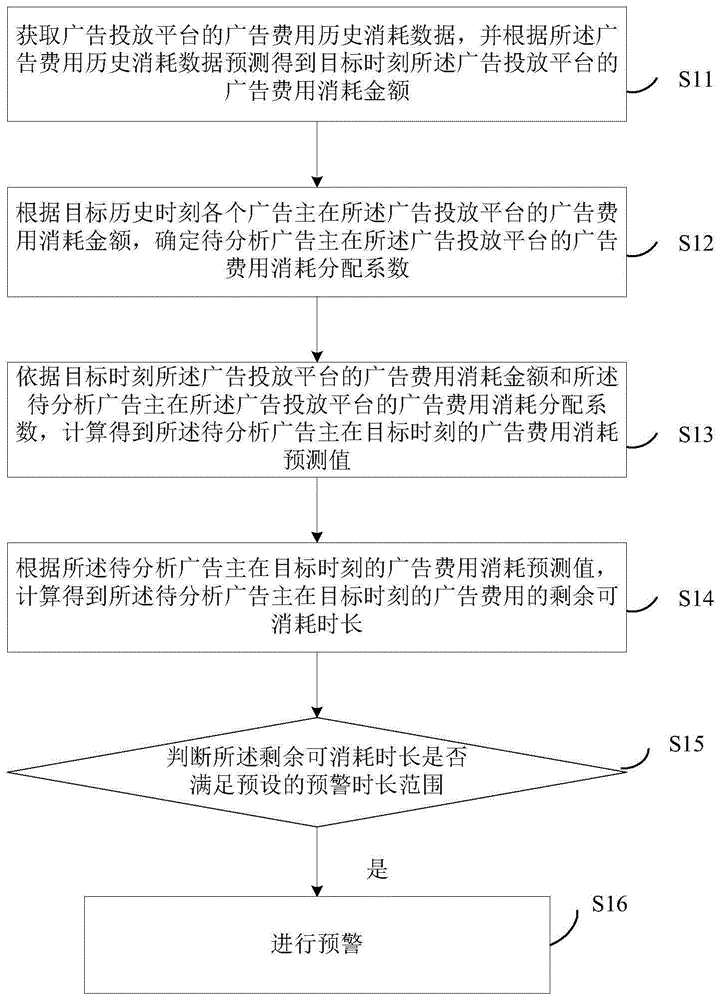 Compared with the prior art, the method comprises the steps of firstly predicting the advertisement expense consumption amount of the advertisement putting platform at a target moment according to the historical advertisement expense consumption data of the advertisement putting platform; then, the distribution coefficient of the advertisement expense consumption of the advertiser to be analyzed on the advertisement putting platform is determined, the advertisement expense consumption predicted value of the advertiser to be analyzed at the target moment is obtained through calculation according to the distribution coefficient, finally, the consumable duration of the advertisement expense is obtained through calculation according to the consumption predicted value, and the early warning function can be finally achieved through judgment with the threshold value. The consumption prediction value of the advertiser to be analyzed is obtained by calculating the prediction of the overall consumption of the advertising cost and the distribution coefficient in the process of calculating the consumption prediction value of the advertiser to be analyzed, so that the obtained consumption prediction value of the advertiser to be analyzed is more accurate, and consumption duration early warning can be performed according to the consumption prediction value of the advertiser to be analyzed.